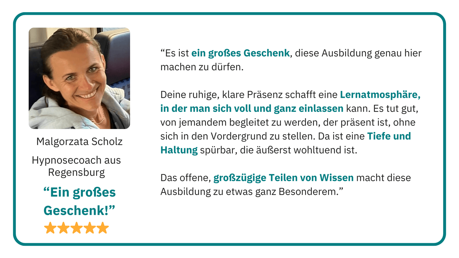 „Wir haben tolle Sessions gehabt. Unfassbar tief, bestärkend, einzigartig und auflösend. Hypnose hat mir schnell effizient geholfen, wieder voranzugehen. Es ist spürbar mit wie viel Kompetenz und Empathie Michaela begleitet."